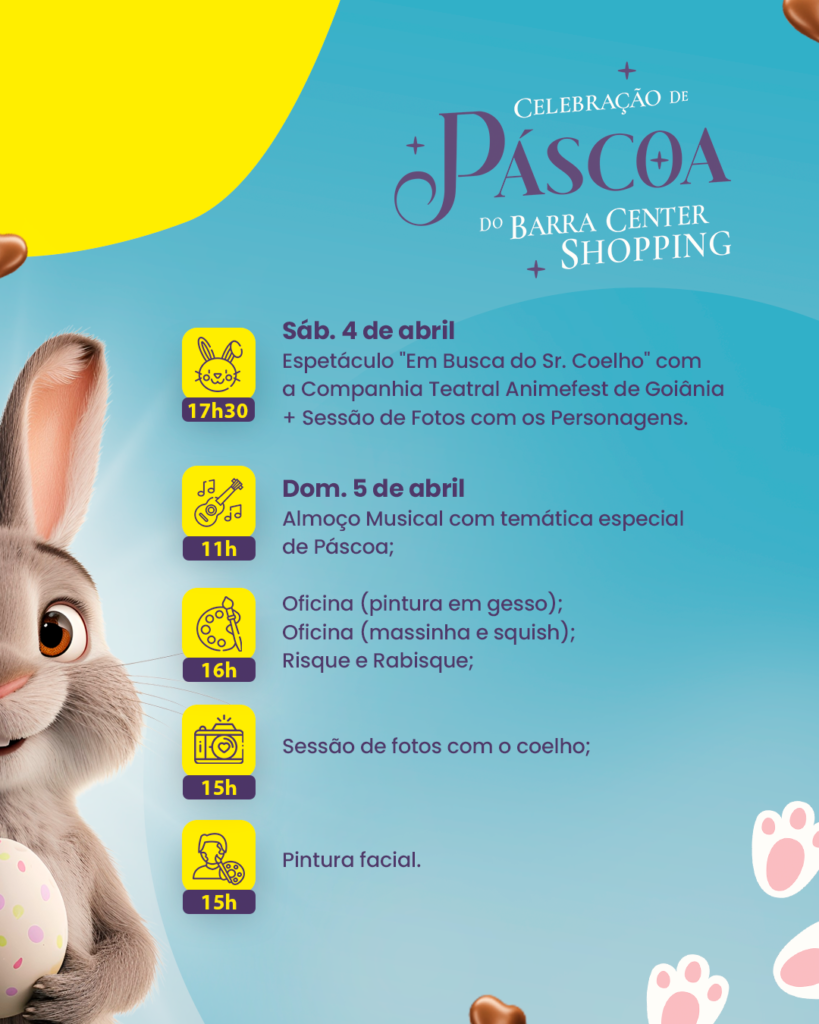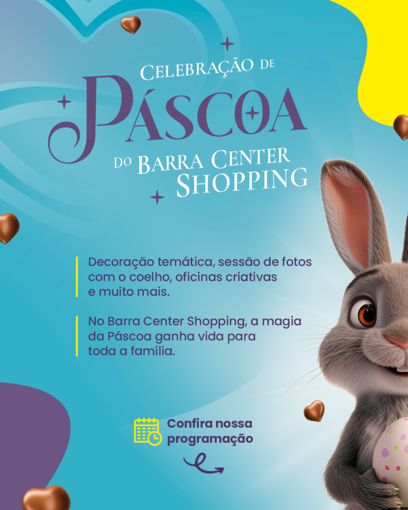 Confira a programação completa nas redes sociais e participe desta celebração especial de Páscoa. Vem que no Barra Center Shopping tem!