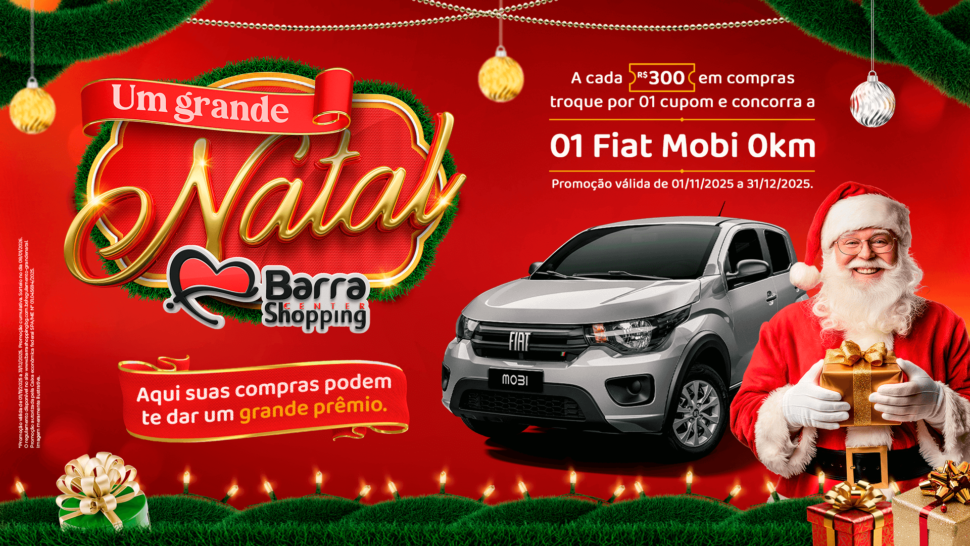 A promoção Um Grande Natal acontece no período de 1º de novembro a 31 de dezembro de 2025 e é válida para compras realizadas nas lojas participantes do Barra Center Shopping. A dinâmica é simples e acessível: a cada R$ 300,00 em compras, o cliente recebe um número da sorte para concorrer ao prêmio principal da campanha, um automóvel Fiat Mobi Like 1.0 zero quilômetro. As compras são cumulativas, ou seja, é possível somar diferentes cupons fiscais até atingir o valor necessário para gerar novos números da sorte, aumentando as chances de ganhar.